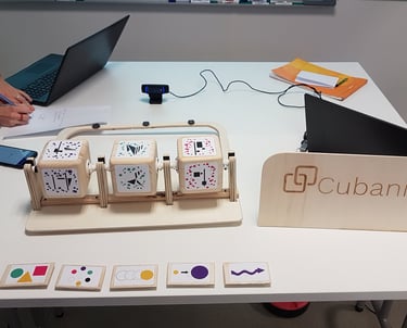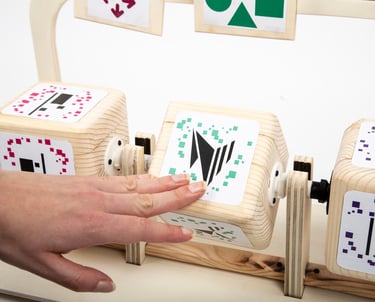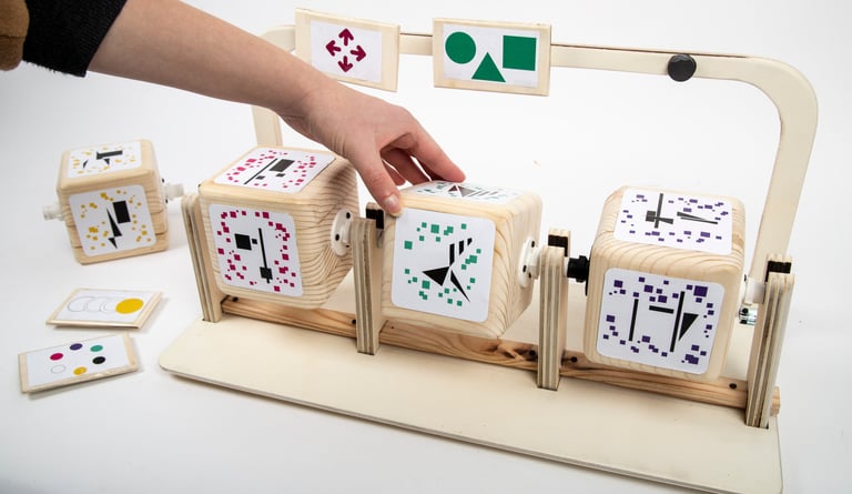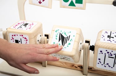 We now have multiple cubes that we can apply on a wooden base to rotate. Every cube is removable to modify the parameter we want to interact with during the representation, and the base is clippable on a wheelchair.