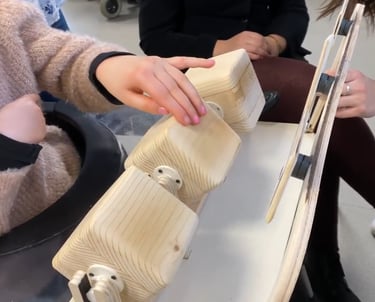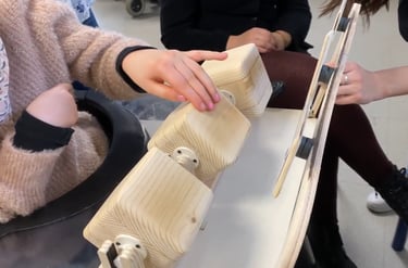 The tangible object had to be handled by the hand or the chin. After some tests, the movement of rotation seemed the easiest to put in practice by the members of the group. We chose to use wood with soft edges to prevent any potential harm due to uncontrolled or unprecise movement.