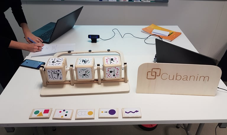 Each cube represents one parameter of the chosen animation. For that, we used the principle of picture targets and augmented reality (AR) with Vuforia in Unity.